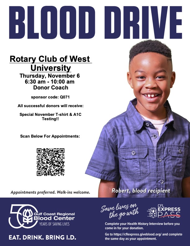 November began at a brisk pace for West U Rotarians, and we are off to an inspiring start! Last week’s meeting was a tremendous kickoff to Veterans Recognition Month. We were honored to welcome Rice University President Reginald “Reggie” DesRoches, who delivered an energizing overview of the exciting initiatives underway at Rice. He concluded with a teaser about a major investment announcement that same afternoon—proof that great things continue to unfold right here in our community.